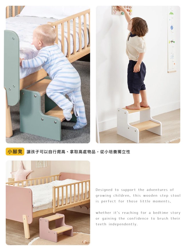 小孩爬高看父母在做什麼料理,順手讓孩子試吃。親子關係在不知不覺中,累積幸福的記憶。無銳角設計,腳踏時邊緣圓角不刮傷、不碰傷肌膚,兒童使用上更加安全。作為小腳凳,孩子可以自行爬高、拿取高處物品,從小培養獨立性;作為小椅凳,雙層階讓小腳踏實好坐。圓角安全設計,小孩坐著不易撞傷。
