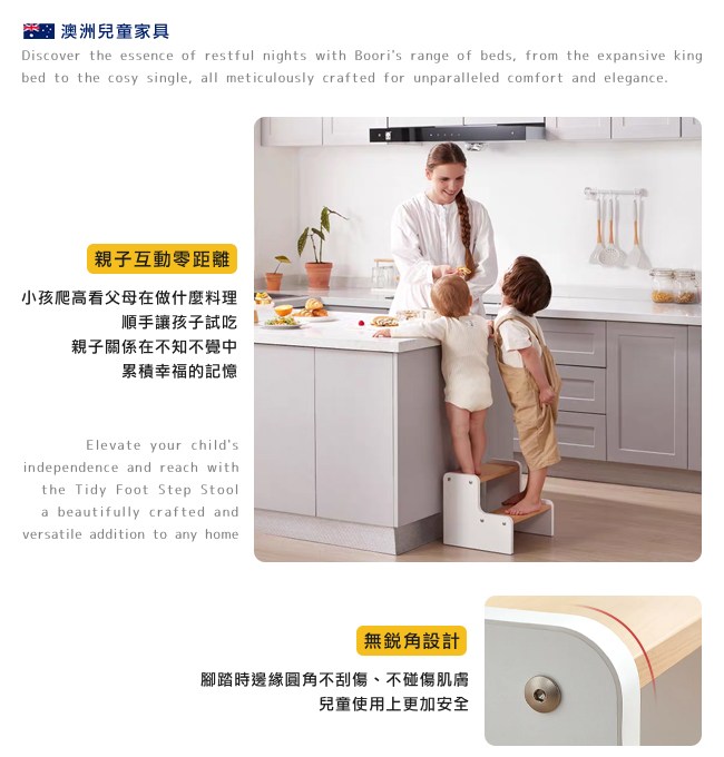 1993 年 Boori 第一間門市在澳洲雪梨開始營運。30 年後在全球 7 個國家有服務據點,成為全球兒童家具品牌,受到百萬家長信任。使用 FSC 認證木材,品質優良,對環境友善。透過獨特細膩的工匠技藝,讓每一件家具均是精心製作,經久耐用。