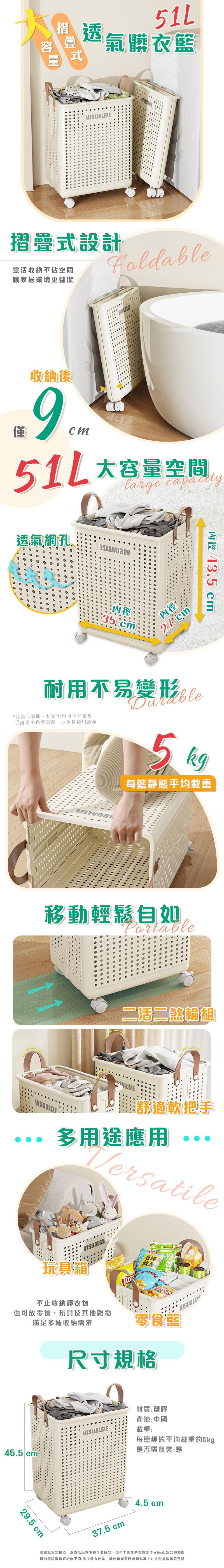 【品樂生活】大容量摺疊透氣髒衣籃(附輪組) LB53L-WT 洗衣籃 置物籃 菜籃