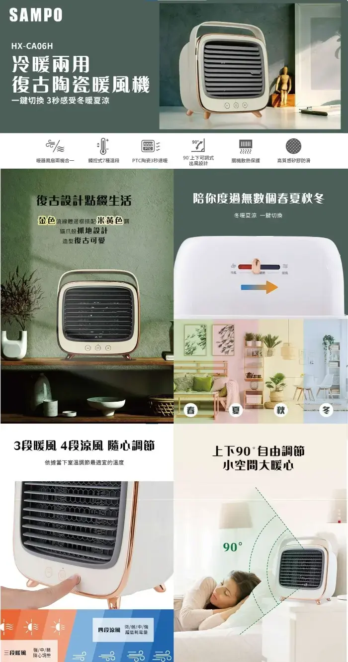 1.冬暖夏涼一鍵切換,3段暖風+4段冷風選擇,觸控操作隨心調整