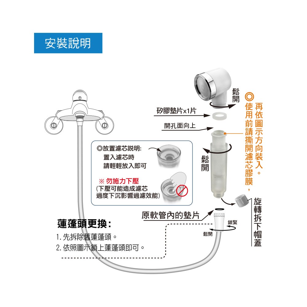 新三段淨水除氯蓮蓬頭1入含1濾芯/ 替換濾芯(3個) 任選一組