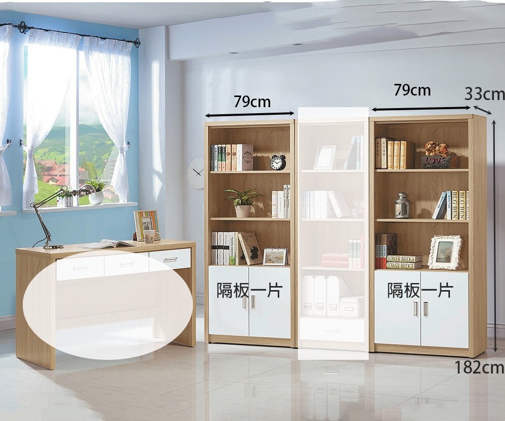 2.7尺書櫃(單只) 寬 79 公分 X 深 33 公分 X 高 182 公分。