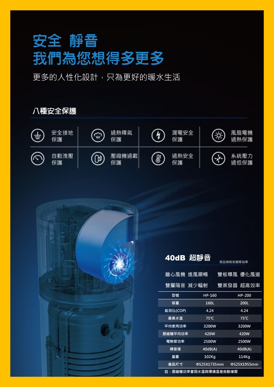 • 混和雙熱力系統:電熱輔助與熱泵雙熱力,快速加熱又省電