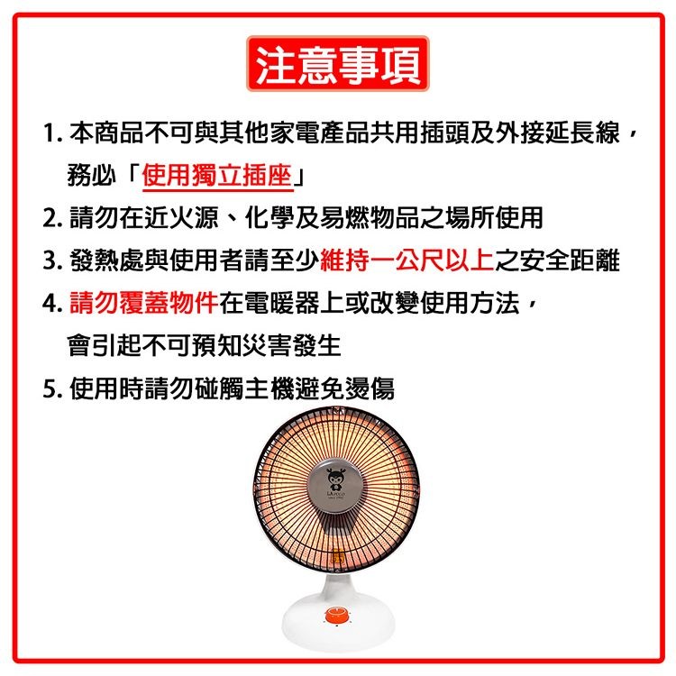 4. 請勿覆蓋物件在電暖器上或改變使用方法,會引起不可預知災害發生