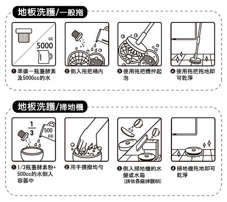3、可直接加入掃地機器人水箱中,掃地機器人拖地使用比例為粉 1/5瓶蓋+500cc水。