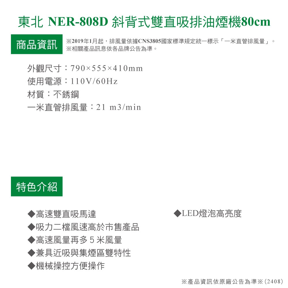※2019年1月起,排風量依據CNS3805國家標準規定