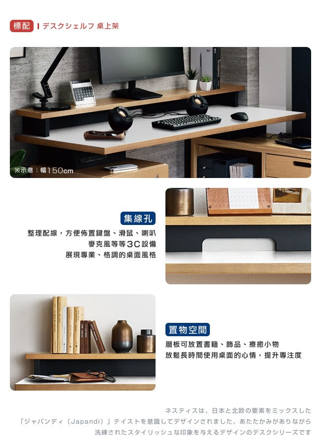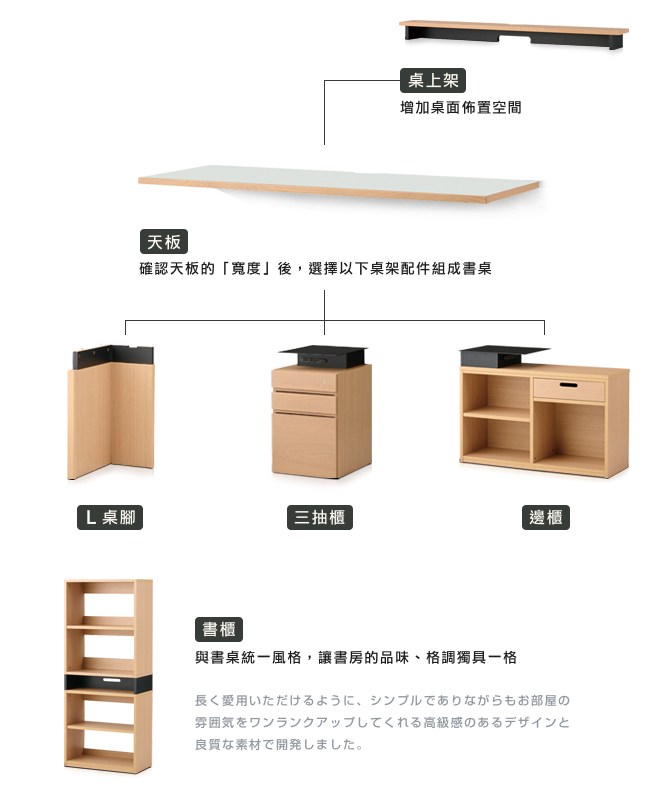 不凡格調,來自獨樹一格的品味,僅獻給鑑賞生活之人。透過不同桌架組合,選配專屬的書桌組。例如專注收納,選配兩個三抽櫃,或著搭配邊櫃、桌上架、書櫃;桌下活動空間寬敞,則使用L桌腳。「設計源於生活,靈感成就未來」不再平凡的生活,從每日使用的書桌組開始。