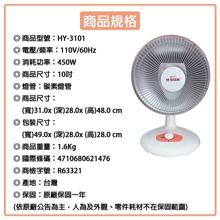 優佳麗 10吋碳素擺動電暖器 HY-3101~台灣製造