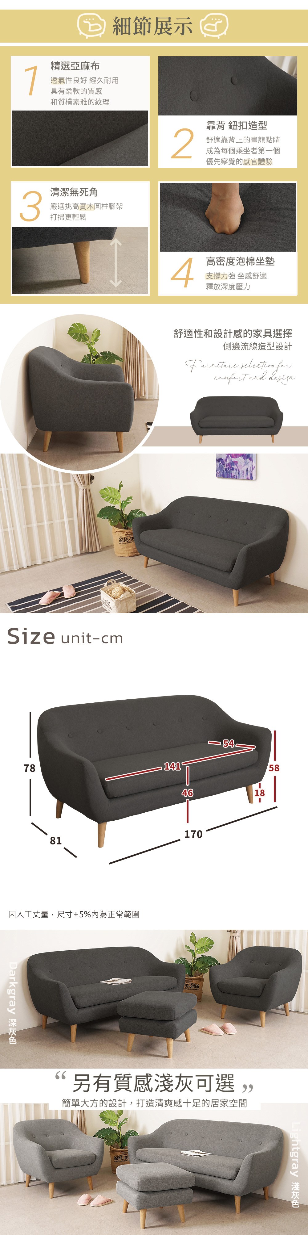 Homelike 喜家居1+3人座亞麻布沙發組(深灰色)(2425)