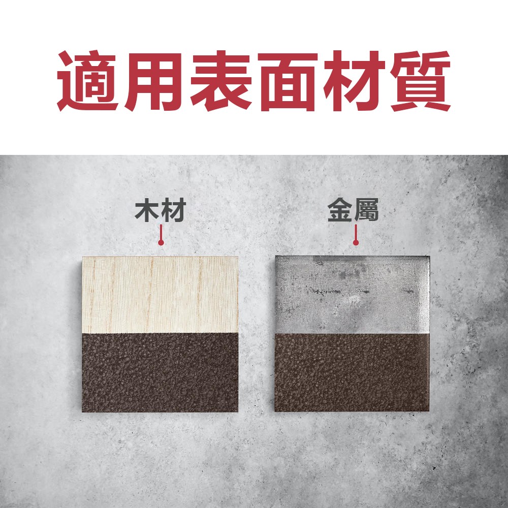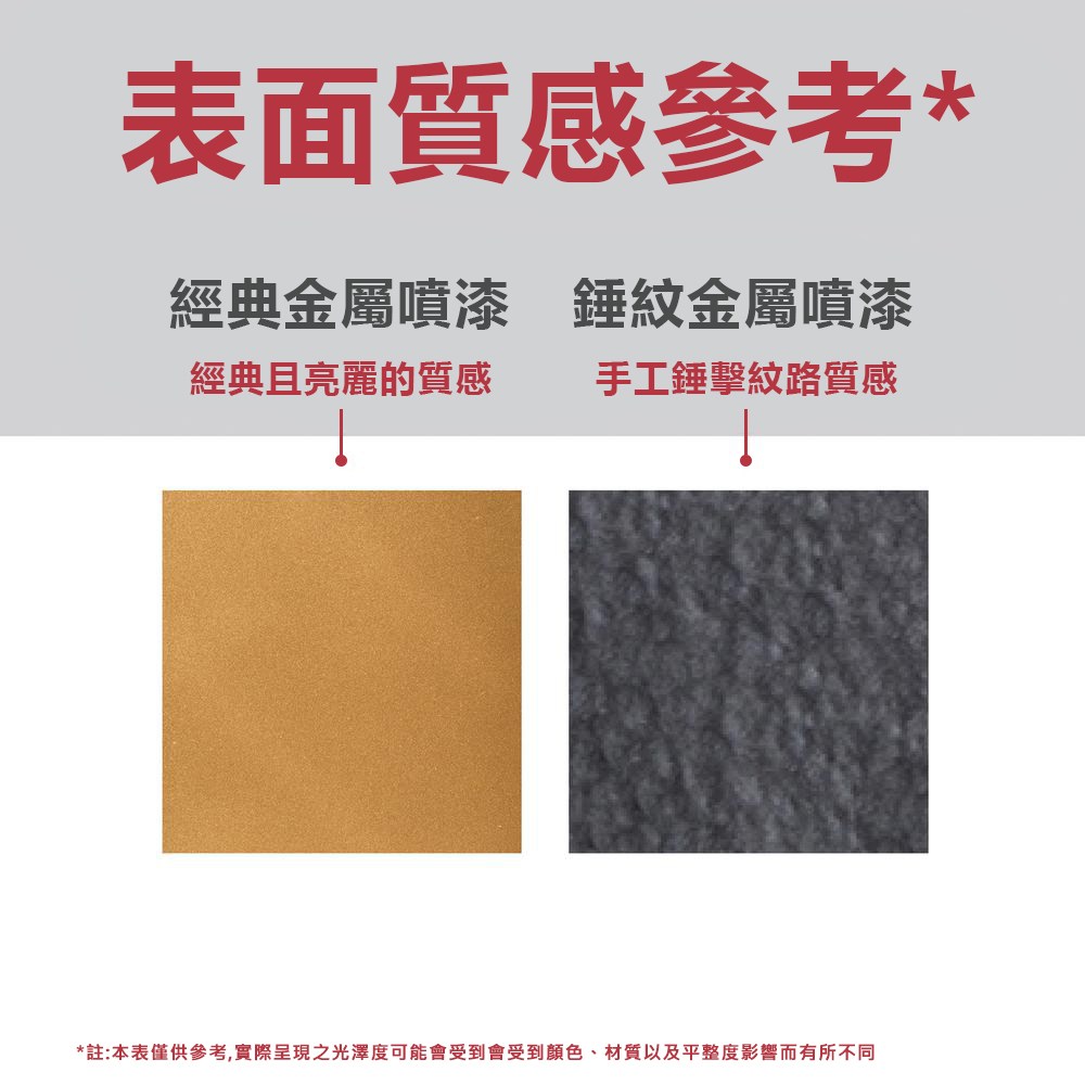 使用說明:使用前請詳閱標籤說明!一罐可用0.4-0.5平方公尺(15%料損),1小時可觸摸,多層多次完整覆蓋表面即可,完整固化須乾燥24小時。為使漆膜達到最佳外觀效果,建議保持20公分左右的距離厚噴,能使表面的錘紋立體感更明顯也更自然。噴塗前請清除表面髒污與碎屑並徹底乾燥表面,視情況可風乾散出金屬內水氣。清除漆料建議使用松香水。