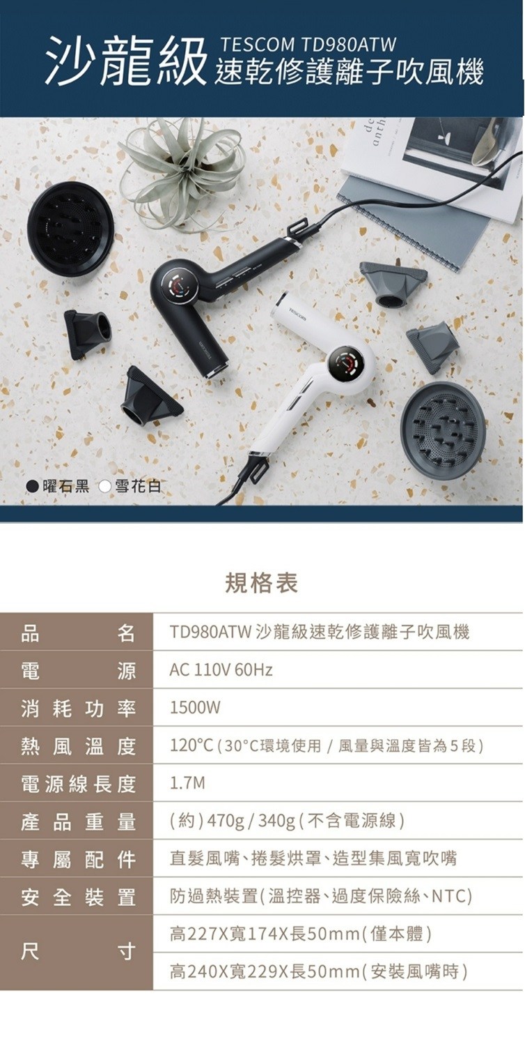 TESCOM 沙龍級速乾修護離子吹風機 TD980ATW黑
