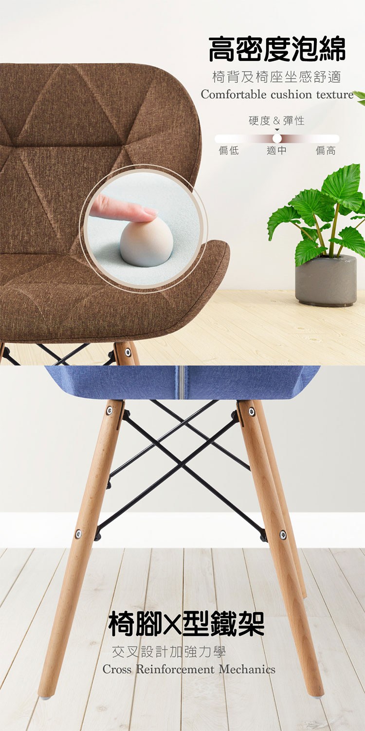 高密度泡棉椅背及椅座坐感舒適,椅腳採X型鐵架交叉設計加強力學,櫸木實木腳,紋理細緻穩固耐用,