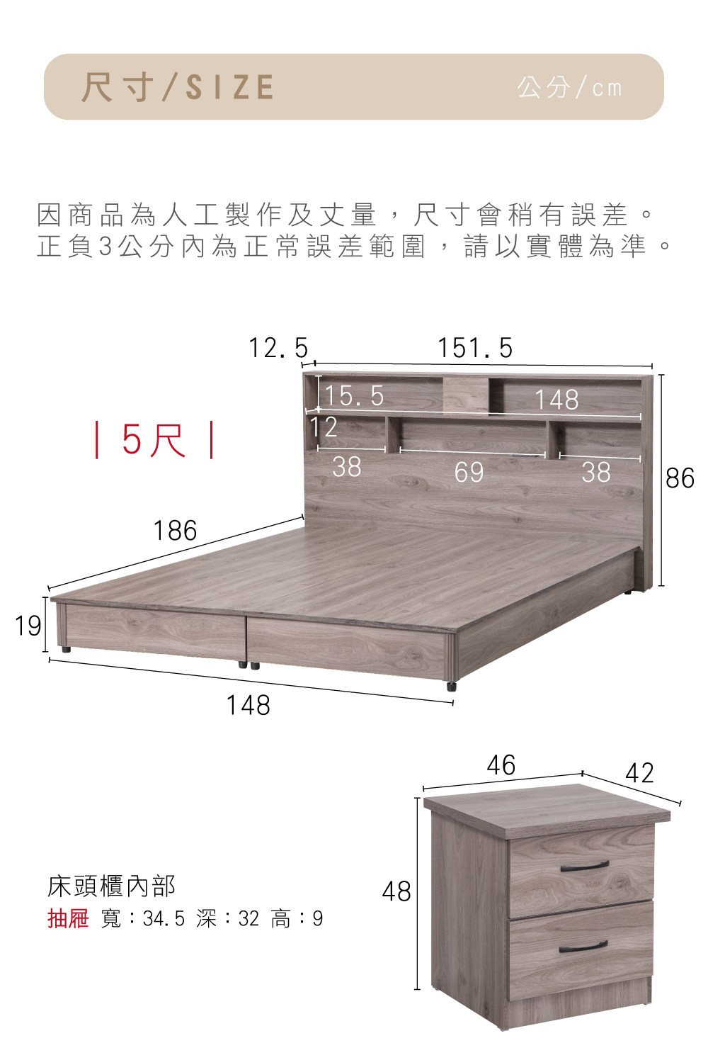 IHouse-品田 房間3件組(床頭箱+6分底+床頭櫃) 單大3.5尺古橡