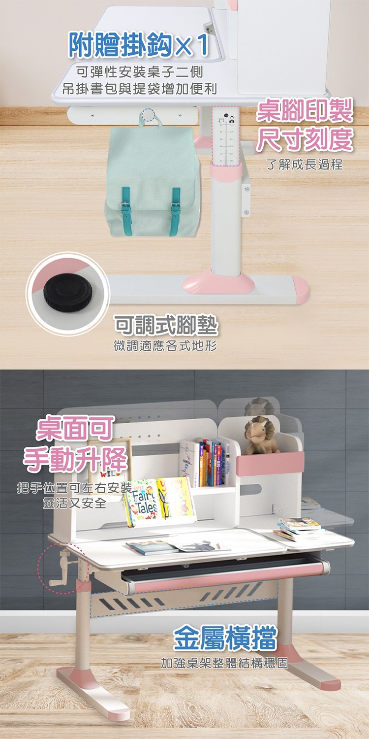 多功能吊掛書包與提袋增加便利,手動式把手,旋轉控制桌面升降,手把位置可左右安裝靈活又安全,