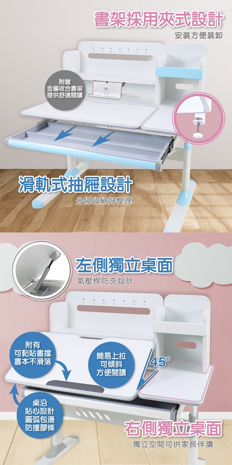 右側獨立桌面空間可供家長伴讀,滑軌式抽屜設計分隔收納好整理,附一個掛勾可彈性安裝桌子二側,