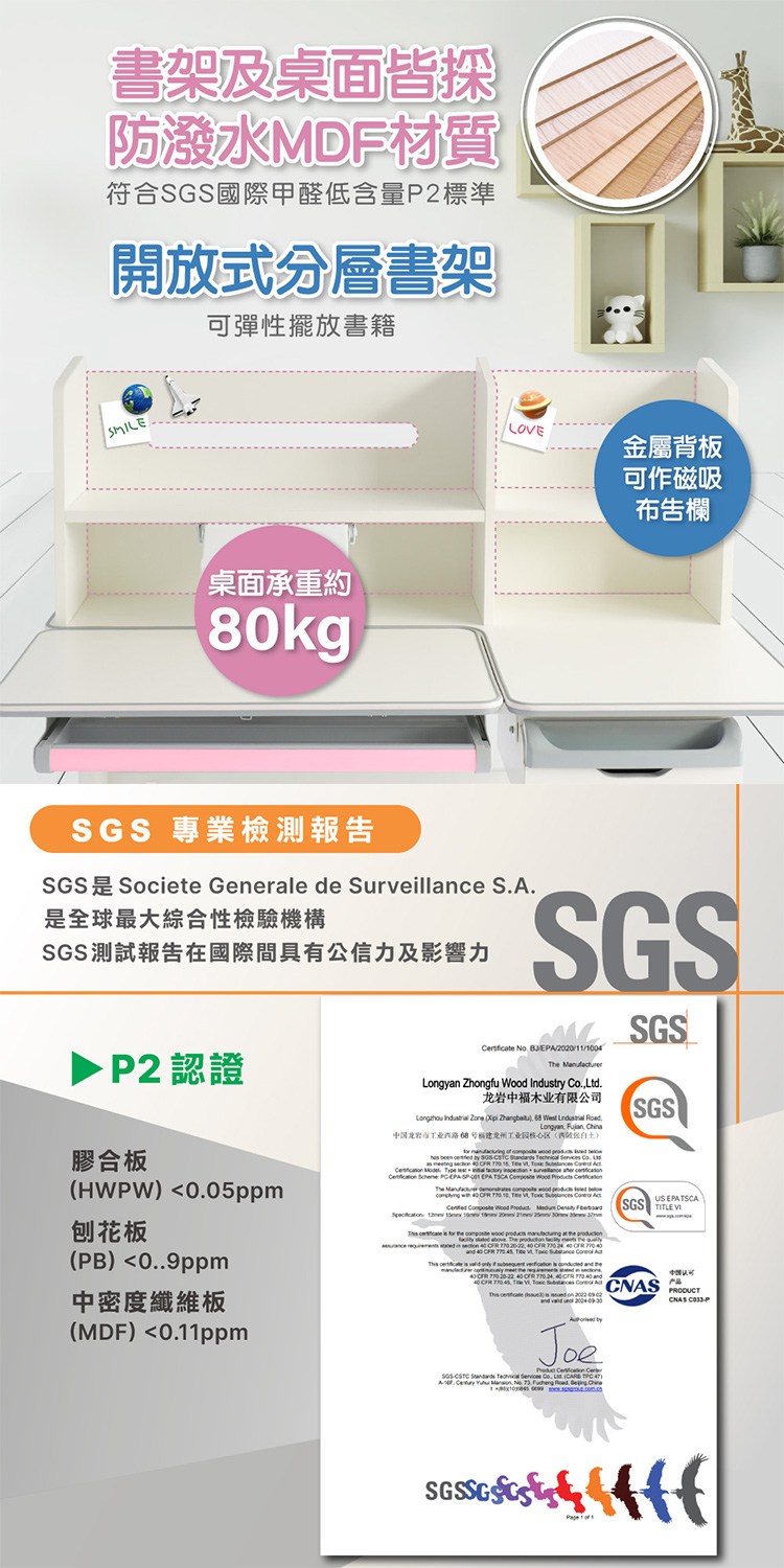 台灣與歐美同步販售、美規設計,書架及桌面皆採防潑水MDF材質,符合SGS國際甲醛低含量P2標準,