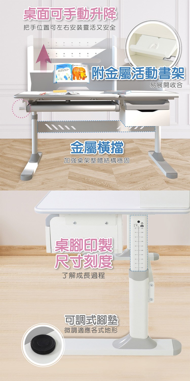手動式把手,旋轉控制桌面升降,手把位置可左右安裝靈活又安全,桌腳印製尺寸刻度了解成長過程,