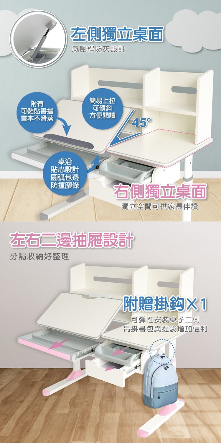 桌沿貼心設計圓弧包邊防撞膠條,桌面附有可黏貼書擋書本不滑落,右側獨立桌面空間可供家長伴讀,