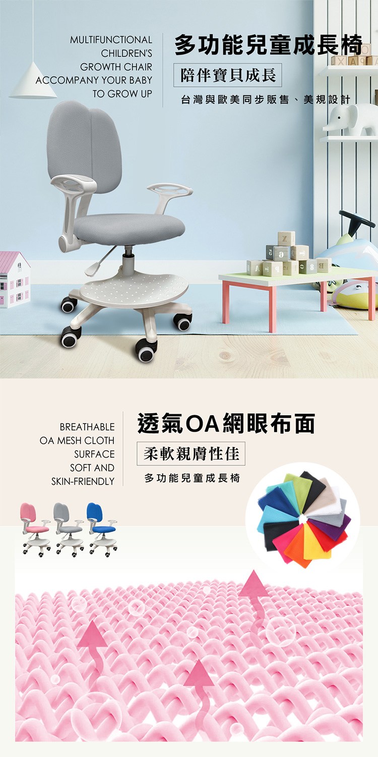 台灣與歐美同步販售、美規設計,透氣OA網眼布面、柔軟親膚性佳,背高以旋鈕微調高低、適合成長,