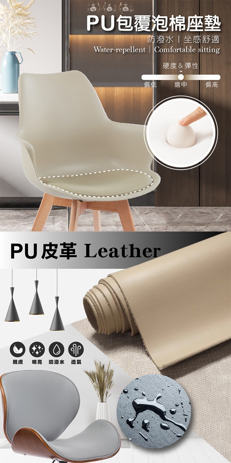 防潑水PU包覆泡棉座,坐感舒適,櫸木實木腳,紋理細緻穩固耐用,附贈防刮腳墊、耐磨並保護地板,