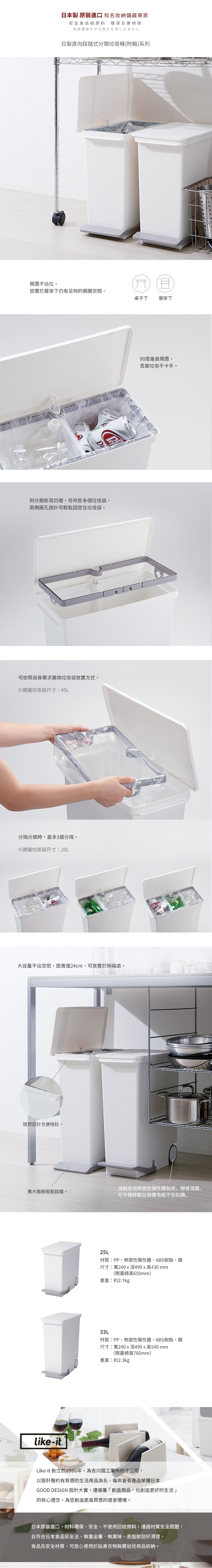 like-it 直立型腳踏式分類垃圾桶 25L 白色 24 x 49 x 43cm