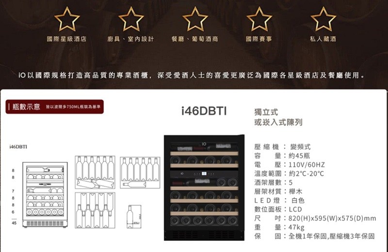 限期贈真空儲物機  IO 單門雙溫酒櫃 i46DBTI 變頻系列
