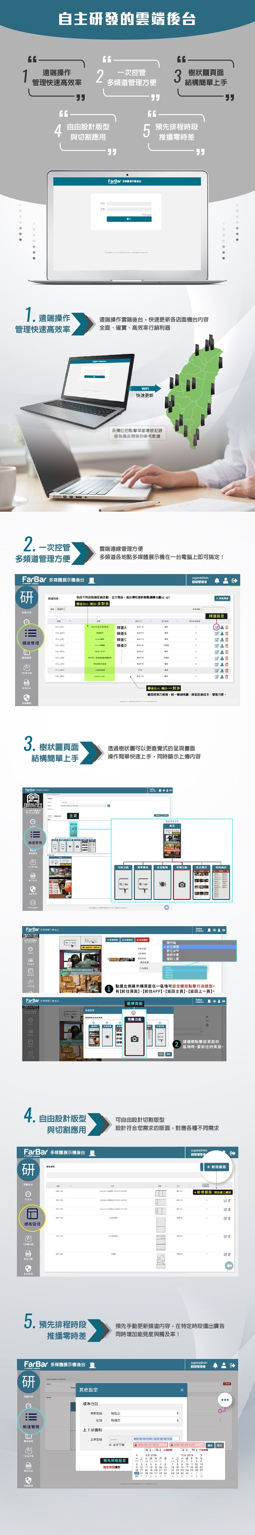 透過WiFi連線連至雲端後台,遠端操作即時更新,一次控管多台設備的頻道