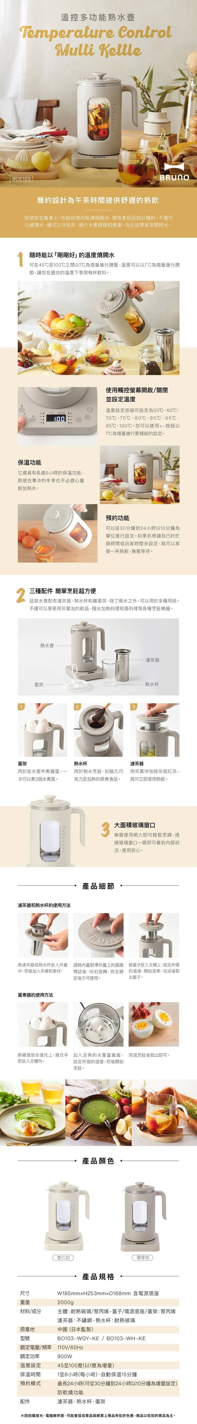 【日本 BRUNO】 1L 溫控多功能熱水壺/快煮壺 BOE103 杏仁白 附煮蛋架和濾網