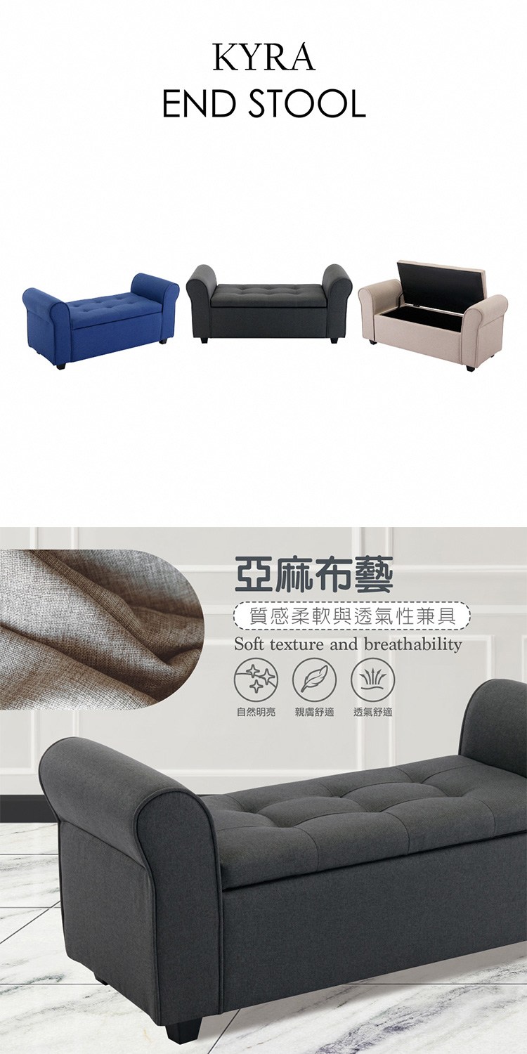 [E-home]Kyra凱拉歐式拉扣布面扶手收納長凳,古典歐式巴洛克風格與現代融合,打造時尚的簡約風。