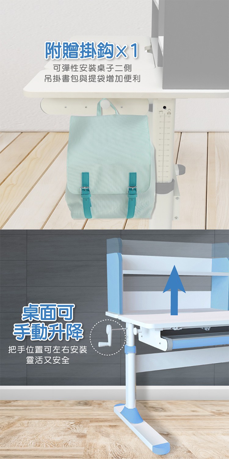 手動式把手,旋轉控制桌面升降,手把位置可左右安裝靈活又安全,桌腳印製尺寸刻度了解成長過程,