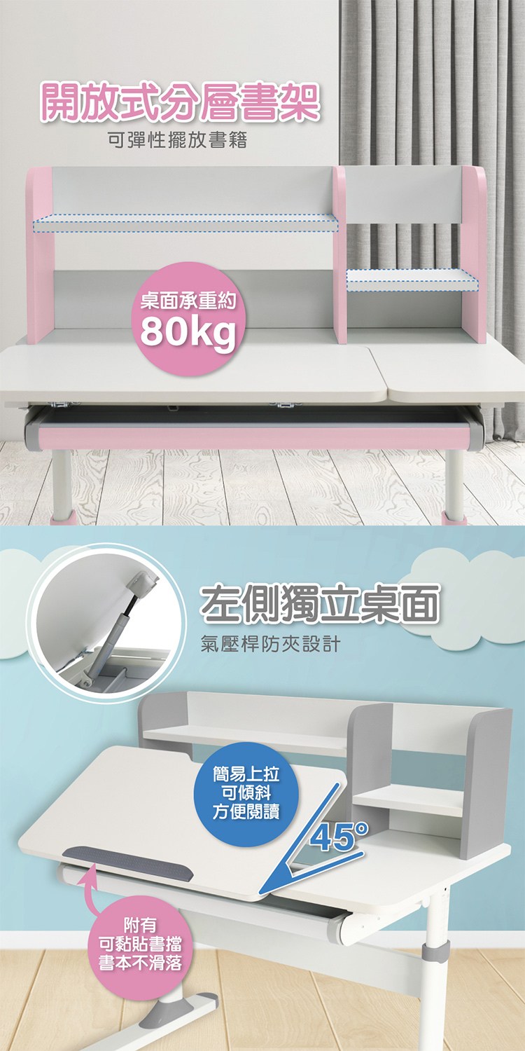 桌面亦可承重平均受力約80公斤,開放式分層書架可彈性擺放書籍,左側為氣壓桿防夾設計獨立桌面,