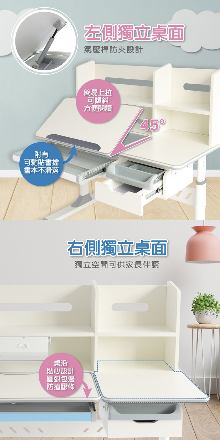 桌沿貼心設計圓弧包邊防撞膠條,桌面附有可黏貼書擋書本不滑落,右側獨立桌面空間可供家長伴讀,