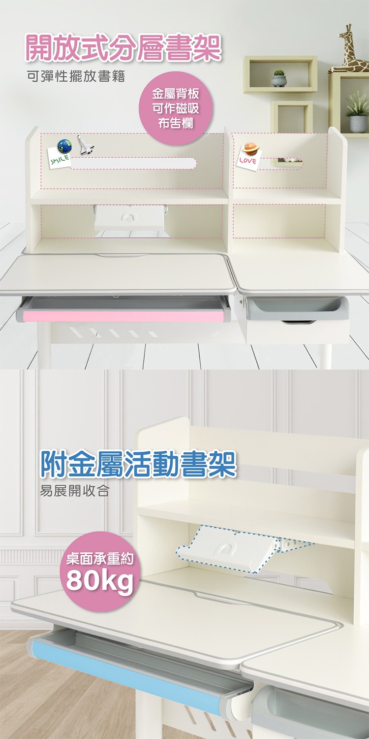 桌面亦可承重平均受力約80公斤,書架的金屬背板可作磁吸佈告欄,開放式分層書櫃可彈性擺放書籍,