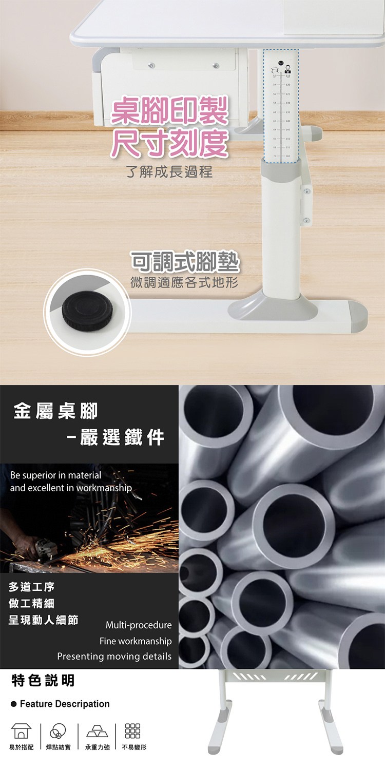 金屬橫擋加強桌架整體結構穩固,可調式腳墊可微調適應各式地形,讓學齡的孩子在樂趣中專注學習,