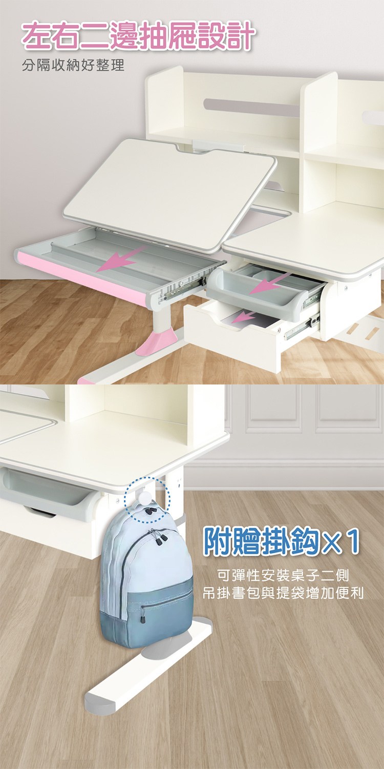 左右二邊抽屜設計可分隔好收納,附一個掛勾可彈性安裝桌子二側,多功能吊掛書包與提袋增加便利,