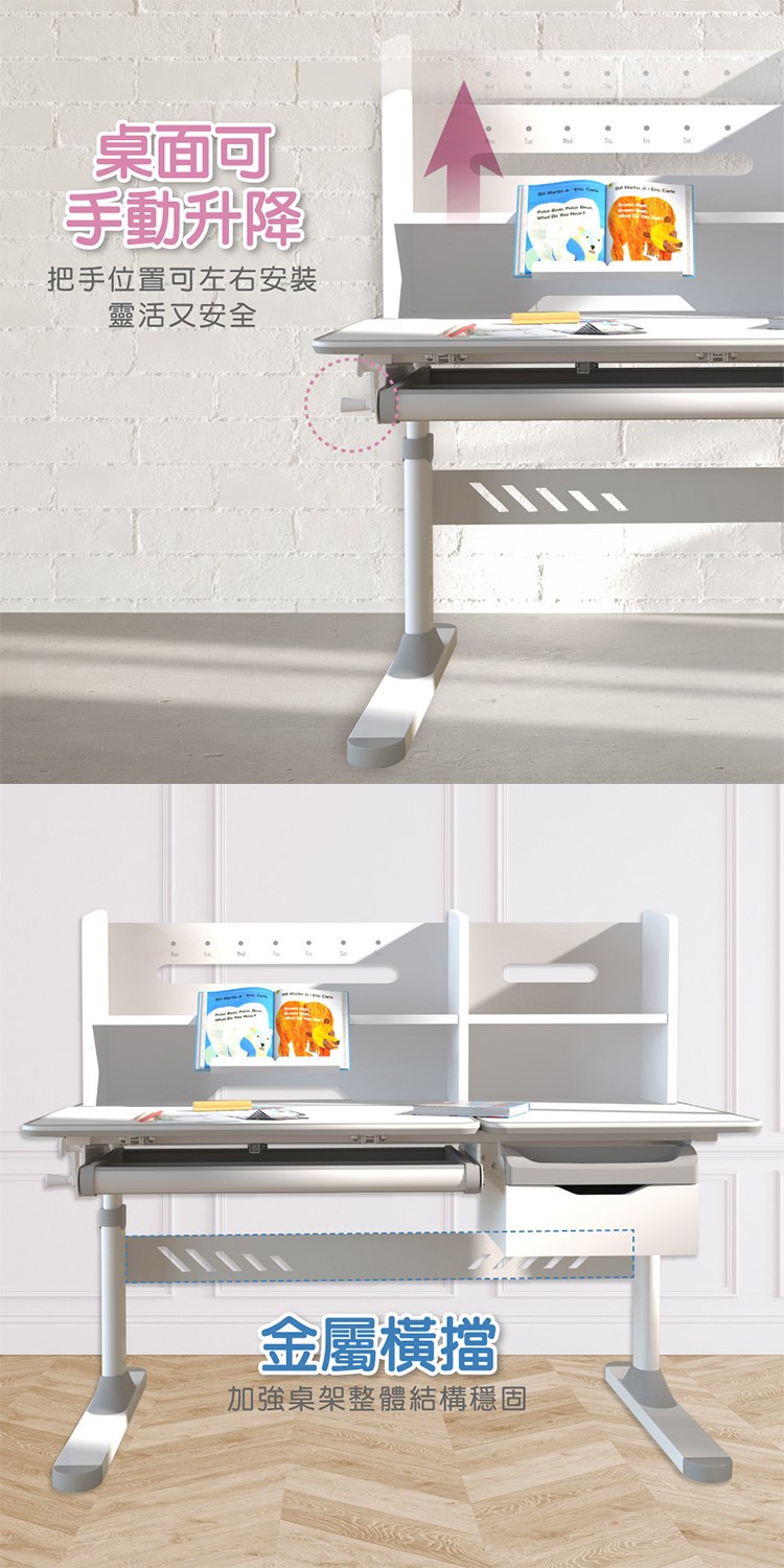 手動式把手,旋轉控制桌面升降,手把位置可左右安裝靈活又安全,桌腳印製尺寸刻度了解成長過程,