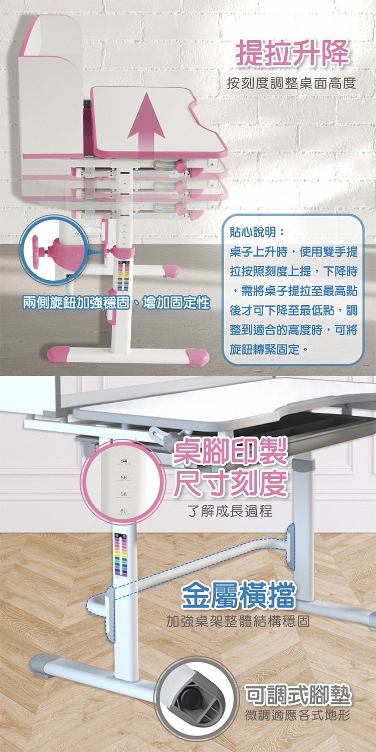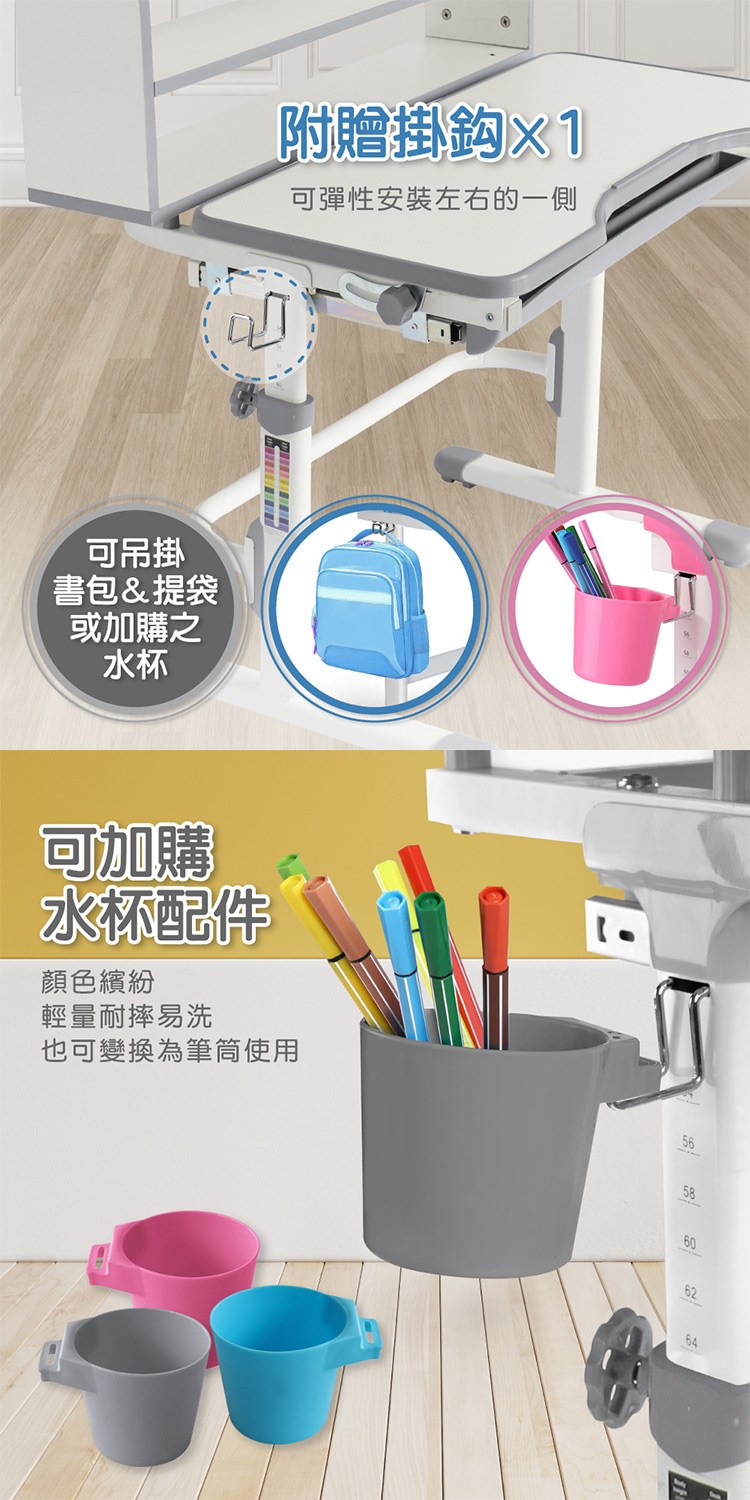 可吊掛書包與提袋或加購之水杯,提拉升降、按刻度調整桌面高度,兩側旋鈕加強穩固、增加固定性,