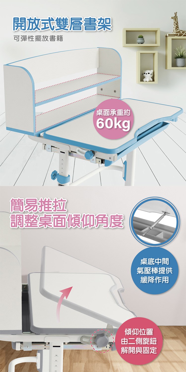 桌面亦可承重平均受力約60公斤,開放式雙層書架可彈性擺放書籍,簡易推拉可調整桌面的傾仰角度,