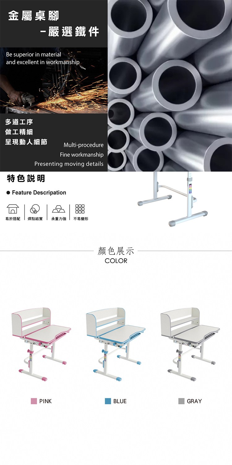 桌腳印製尺寸刻度了解成長過程,金屬橫擋加強桌架整體結構穩固,可調式腳墊可微調適應各式地形,