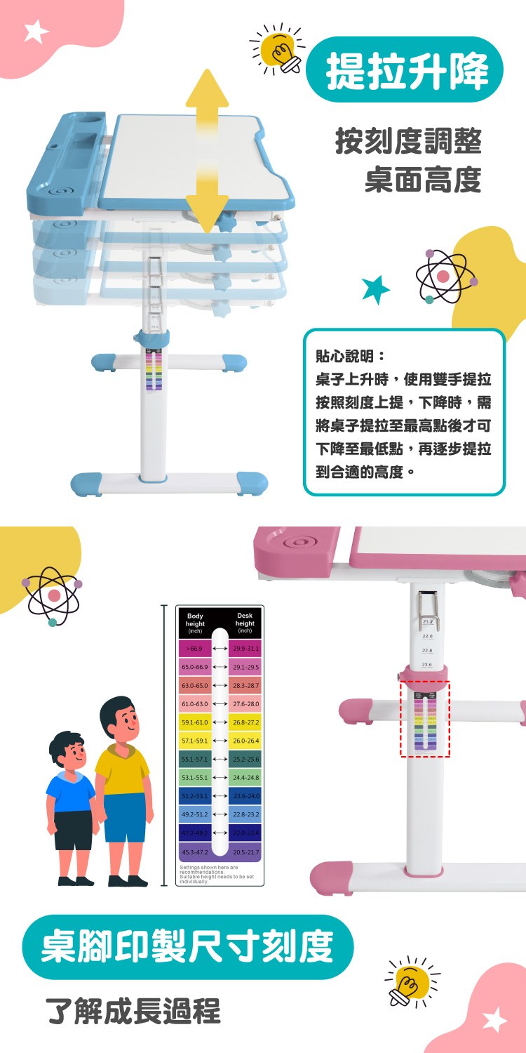 可吊掛書包與提袋或加購之水杯,提拉升降、按刻度調整桌面高度,桌腳印製尺寸刻度了解成長過程,