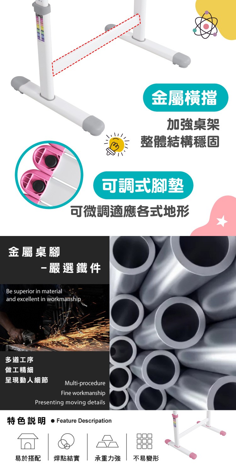 金屬橫擋加強桌架整體結構穩固,可調式腳墊可微調適應各式地形,讓學齡的孩子在樂趣中專注學習。