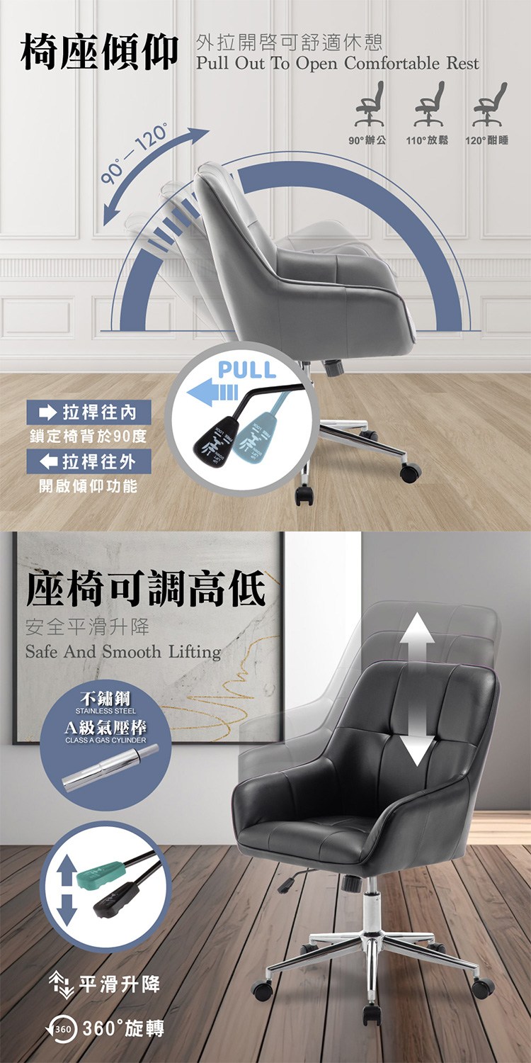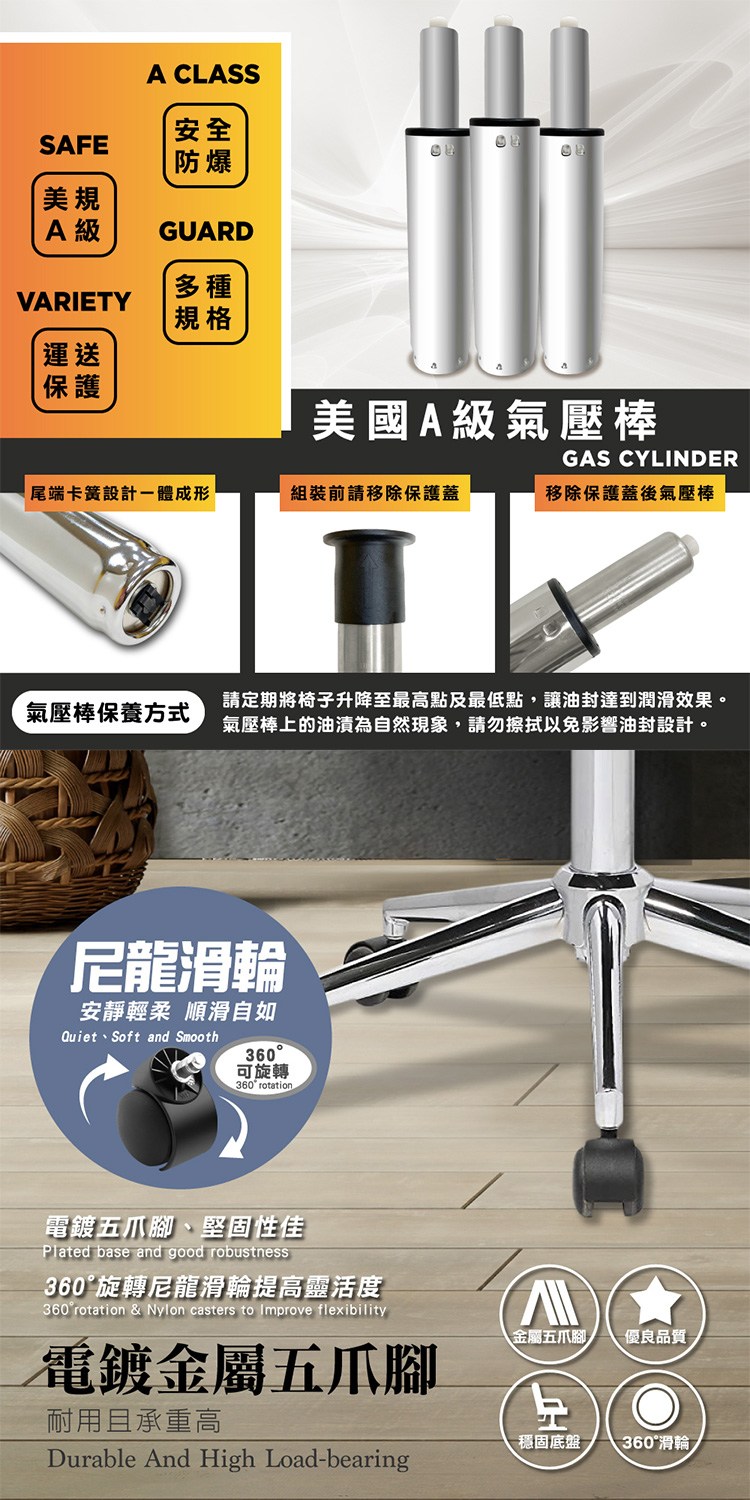 配備美規A級氣壓棒、安全升降,電鍍金屬五爪腳、耐用且承重高,360°旋轉尼龍輪,使用靈活機動,