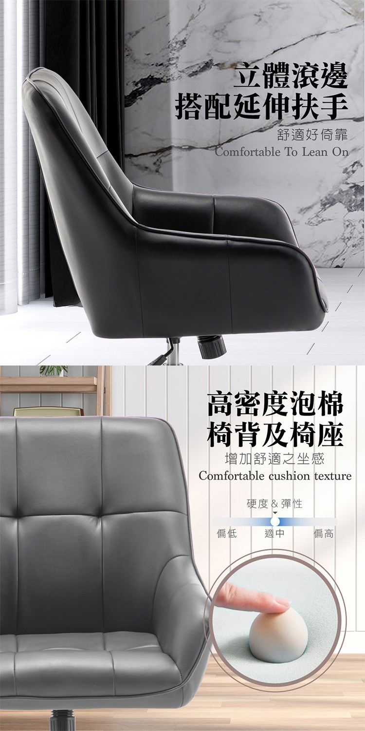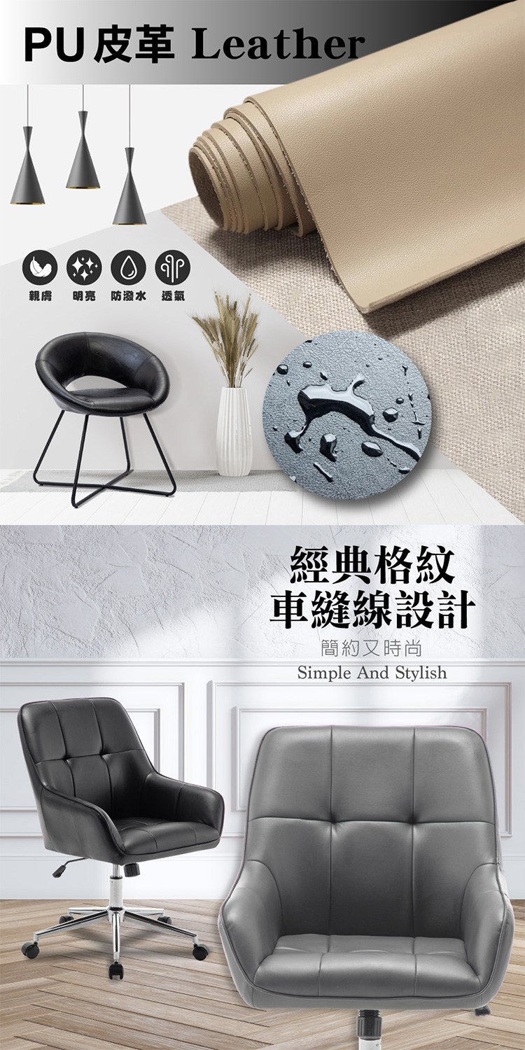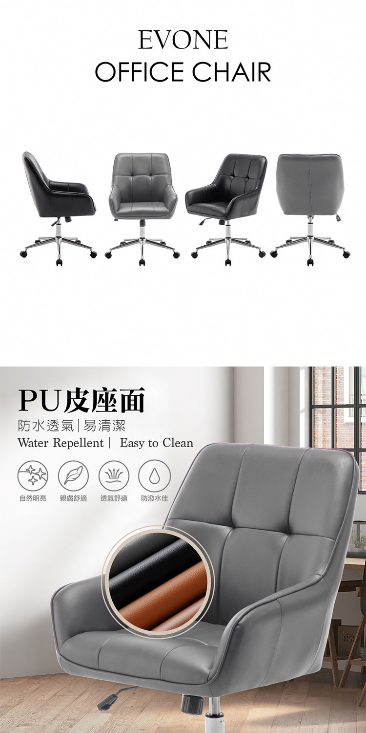 * 防潑水PU皮座面,觸感佳易清潔