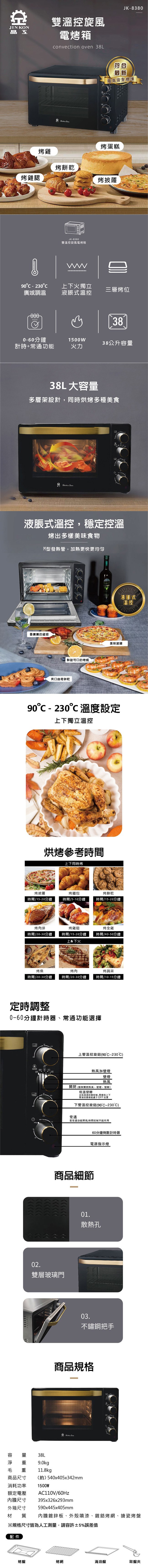 晶工牌38L雙溫控旋風電烤箱 JK-8380