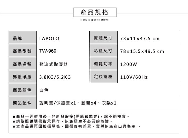 LAPOLO藍普諾對流式房間、浴室兩用電暖器 TW-969