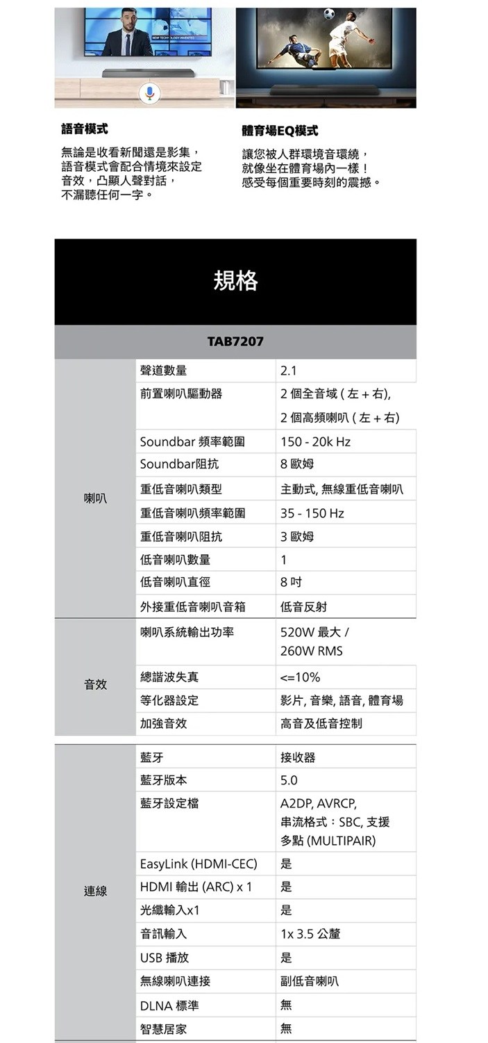 Philips 飛利浦 2.1聲道 聲霸 Soundbar 家庭劇院 TAB7207