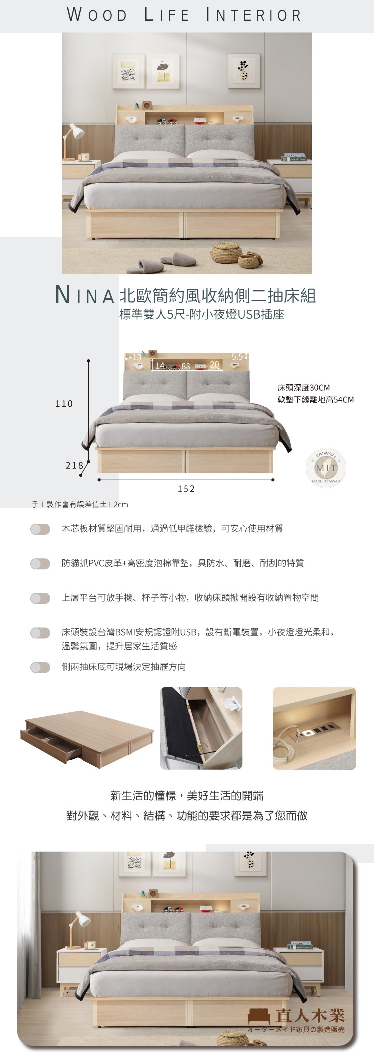 直人木業-NINA北歐簡約風收納大四抽床組-標準雙人5尺(附小夜燈USB插座)