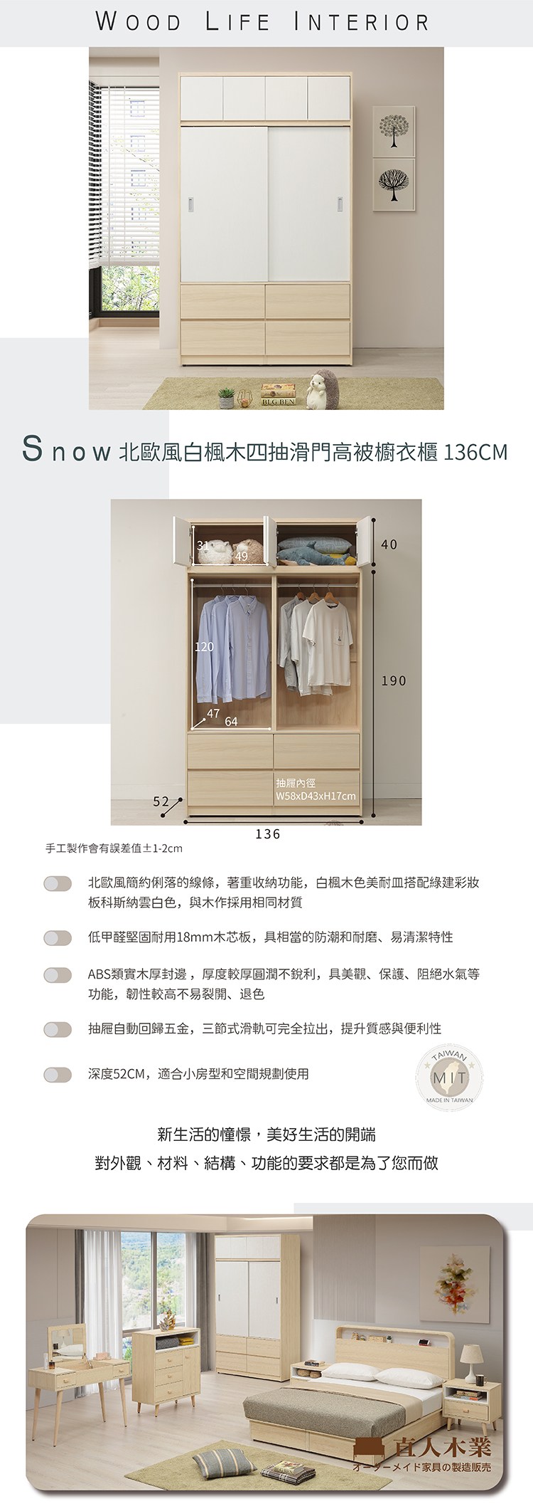 【歐風別館】秋楓5*8尺白楓木色滑門四抽加高衣櫃【棉被櫃】【基隆至台中免運費】