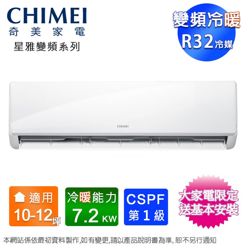 CHIMEI奇美10-12坪一級變頻冷暖分離式冷氣 RB-S72HA1+RC-S72HA1~含基本安裝+舊機回收