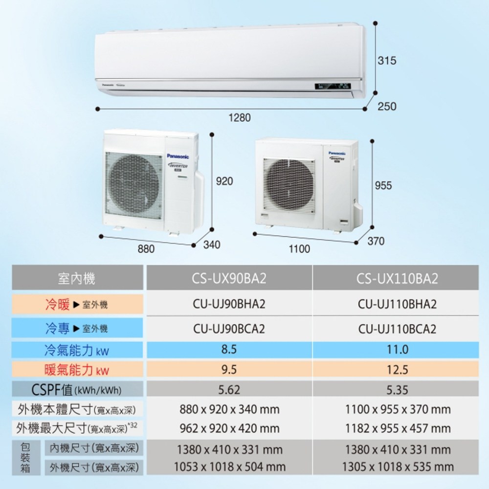 Panasonic 1-1變頻冷暖分離式冷氣 CS-UX/CU-UJ90BHA2